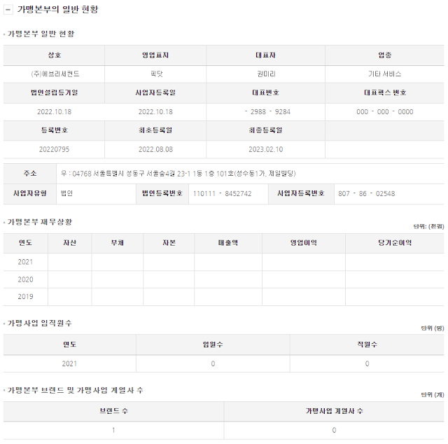 최근 가맹사업을 개시하면서 매장 수가 21개까지 나아가는 등 빠른 속도로 확장에 나서고 있다. 정보공개서를 보면 알다시피 정보가 없을만큼 신생 브랜드이다.