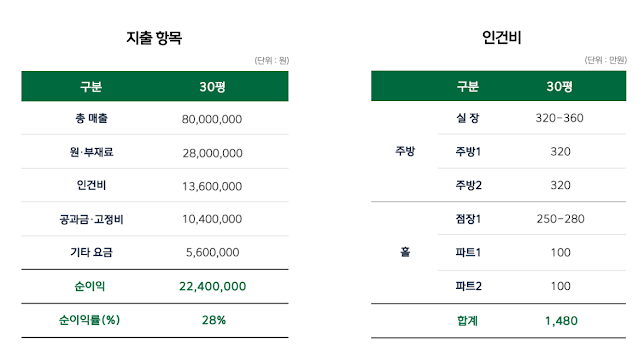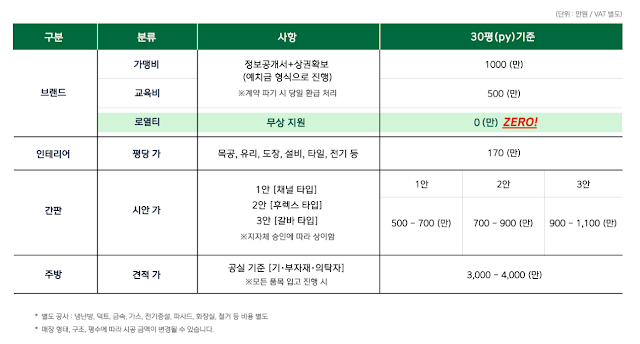 파사드 1~3안에 따라 비용 부담이 달라지나, 개인적으로는 3안이 비싼만큼 이쁘긴하다. 그리고 가맹본부수취금 및 인테리어 비용은 비슷한 평수 대 브랜드에 비해 합리적이라 생각한다.