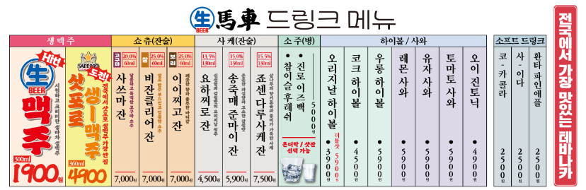 특히 생마차가 유명한 것은 생맥주, 하이볼 등이 매우 싸다는 것인데, 우리는 흔히들 알고 있겠지만 가격이 저렴한 것 만큼 구매결정에 강력한건 없다는 걸 이미들 알고 있다.(단, 다른 요소들이 뛰어나야 경쟁과 재구매에서 밀리지 않음)